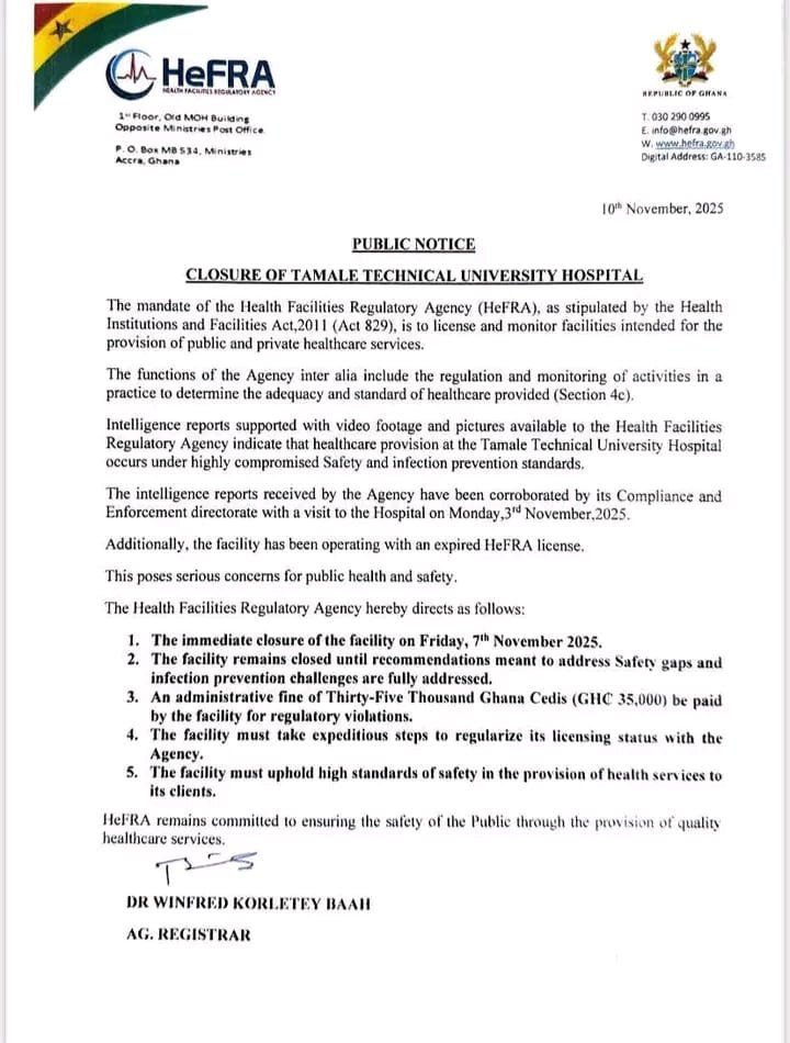 The Health Facilities Regulatory Agency (HeFRA) has taken decisive action, ordering the immediate closure of the Tamale Technical University Hospital due to grave safety violations and serious concerns regarding infection prevention protocols.